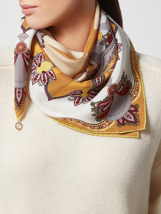 THE SERPENTI PAISLEY SCARF, MADE OF FINELY PRINTED SILK IN WHITE AGATE COLOR, PAIRED WITH BULGARI BULGARI METAL PENDANTS, SUBTLY INTEGRATES BULGARI'S CLASSIC SYMBOLS INTO A WORLD FULL OF DREAMS AND IMAGINATION. EACH ELEMENT UNFOLDS A MAGICAL TRANSFORMATION, SURROUNDED BY BULGARI'S CLASSIC OCTAGONAL PATTERN IN THE CENTER, DESIGNED IN A GEOMETRIC STYLE, SHOWING ENDLESS AND FASCINATING CREATIVE METAMORPHOSIS, REMINISCENT OF THE CONTINUOUS EVOLUTION OF PAISLEY AND GEOMETRIC PATTERNS. THIS VERSATILE PIECE CAN BE STYLED IN DIFFERENT STYLES: TIED AROUND THE NECK FOR A TIMELESS LOOK; TIED AROUND THE WAIST FOR A FEMININE BELT; TIED AS A HAIR ACCESSORY FOR A STYLISH LOOK; OR ADORNED WITH A HANDBAG FOR A PERSONALIZED LOOK. 70 X 70 CM - 27.6 X 27.6 INCHES. 100% SILK. HANDMADE IN ITALY
