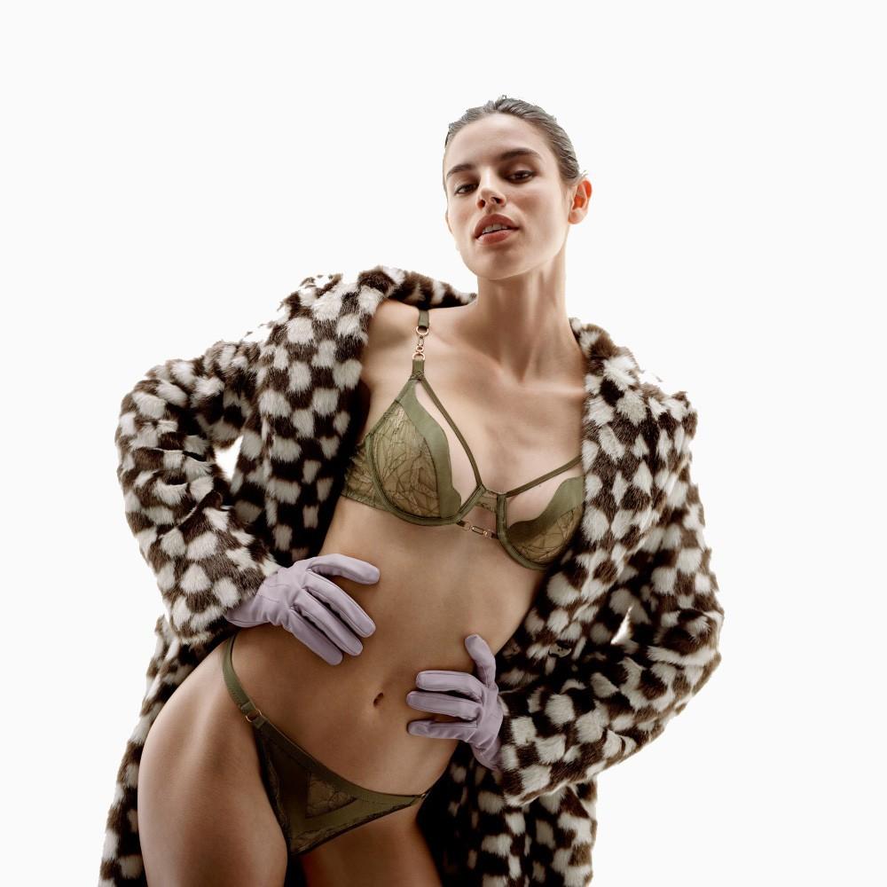 The multi-color metal shape ring exudes a rebellious and rebellious atmosphere, the tulle lightly covers the skin, and the lace creates sexy ripples. The trompe l'oeil hollowed-out skin design uses skin color mesh splicing mousse knitted fabric and Leavers lace to bring infinite reverie to the night! The Spark series released a rare low-spine mesh yarn without lining version with splicing elements of different materials to test the irregular pieces of the sewing process. The brand customized hardware chains that can be exposed and worn, echoing each other. Fashionable haute couture underwear was born!