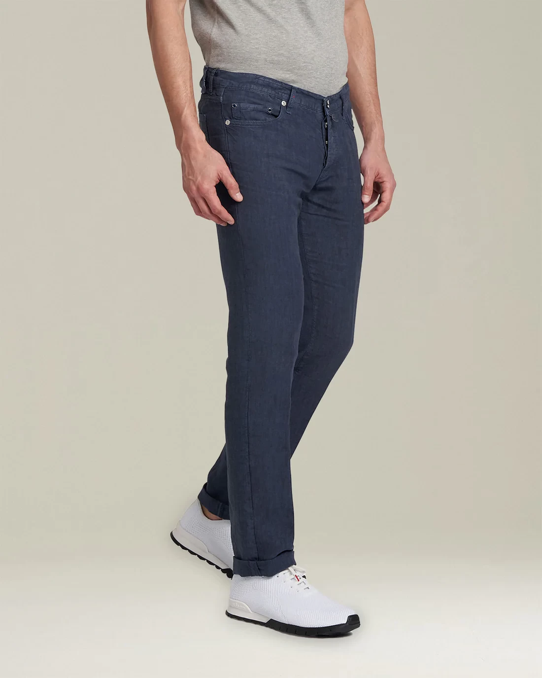 These five-pocket low-rise jeans come in air force blue linen and flaunt an ultra-slim fit. An iconic piece with contemporary, laid-back elegance, Kiton jeans combine their light weight with durability thanks to the double seams that make them indestructible. These non-pleated jeans feature tonal top-stitching, red bar tacks and contrasting red kick tape that reinforces the hem. The hem is 19.5 cm on a size 34. We recommend hand-washing the garment inside out at 30ºC.
