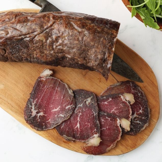 Serving Tips: Our Wagyu Bresaola is a decadent offering on a charcuterie board. Using a very sharp knife or a meat-slicer, cut paper-thin against the grain. You can add a light drizzle of extra-virgin olive oil to bring out its flavor. In Italy, bresaola is often served with a soft cheese, like Robiola, as part of an antipasti course.